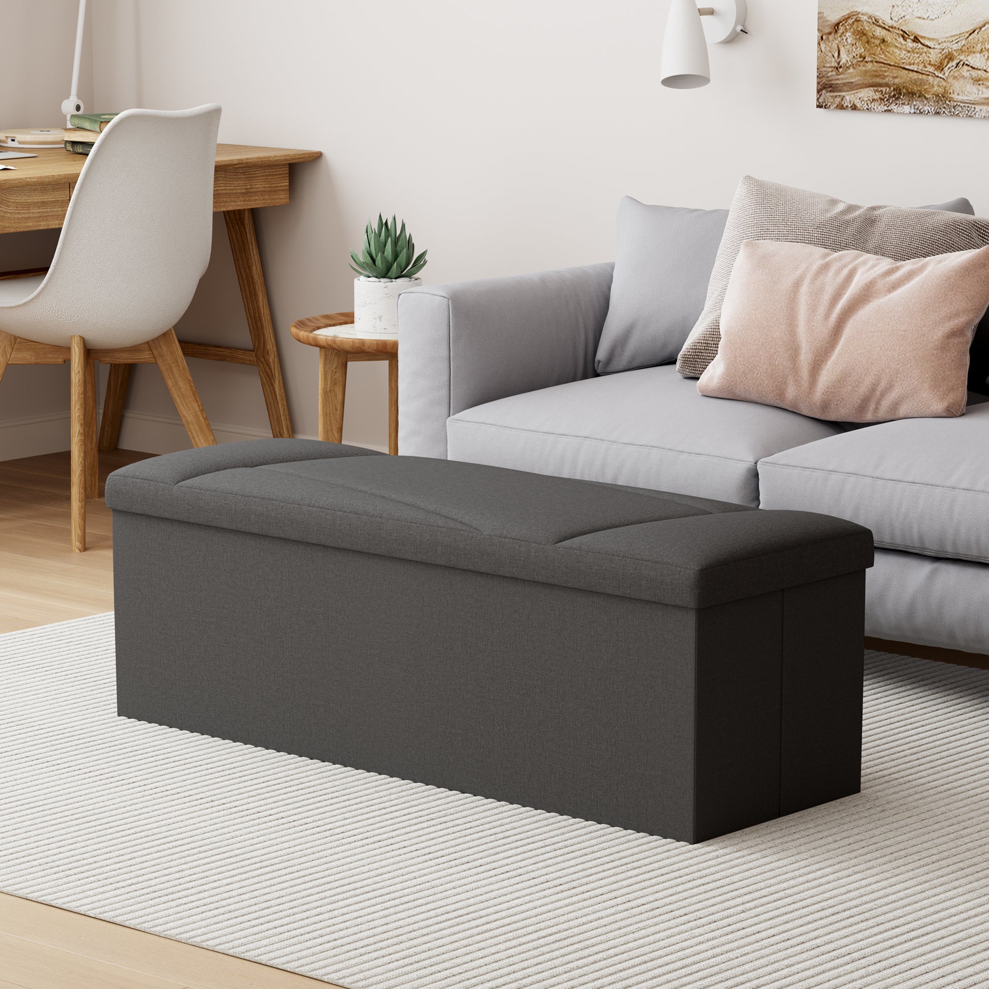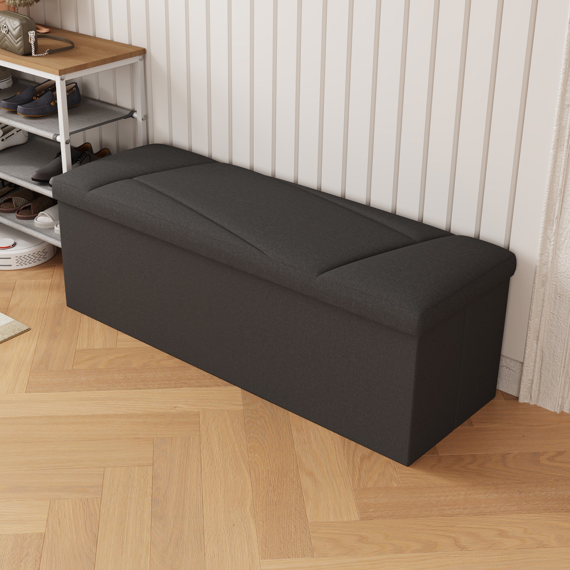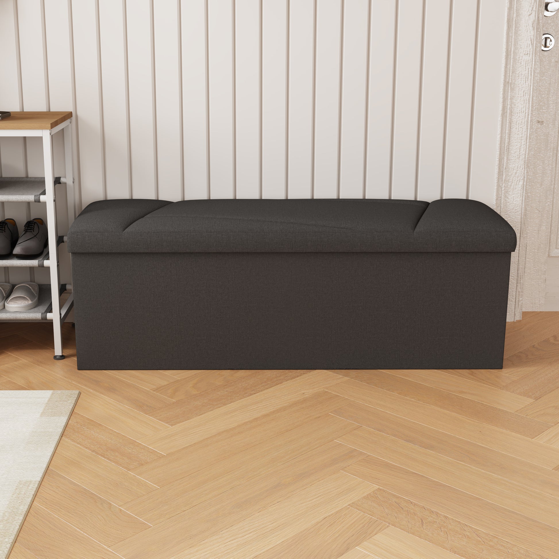 This ZETDIY 43" ottoman with storage is crafted in a beautiful black faux linen. Hold up to 660 lb Capacity, for Bedroom, Living Room, Entryway, Black. It will keep any room or space neat and organized while adding a modern decorative touch. This understated bench doesn't even look like a storage cabinet, but rather like a piece of furniture in your home where guests will never know what's inside! Whether it's your bedroom, living room, entryway or any other room in your home, the ZETDIY 43-inch ottoman with storage is the perfect choice!