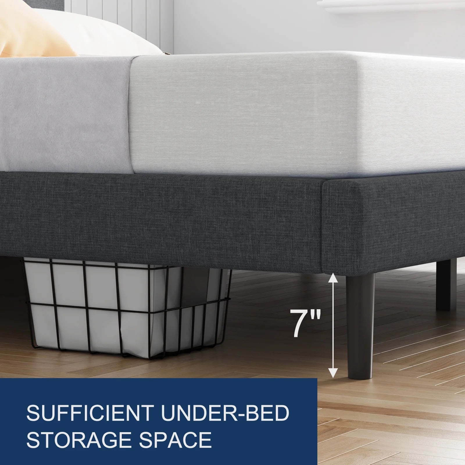 - Heavy Duty Metal and Wood Bed Frame - This upholstered platform bed wood frame is made of sturdy metal construction and solid wood slats, with the optimal structure and the lightest weight ratio. and the sturdy frame to provide dense and strong support for up to 1000 lbs.